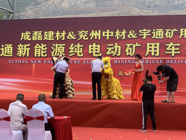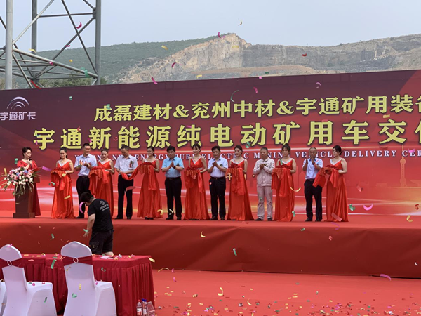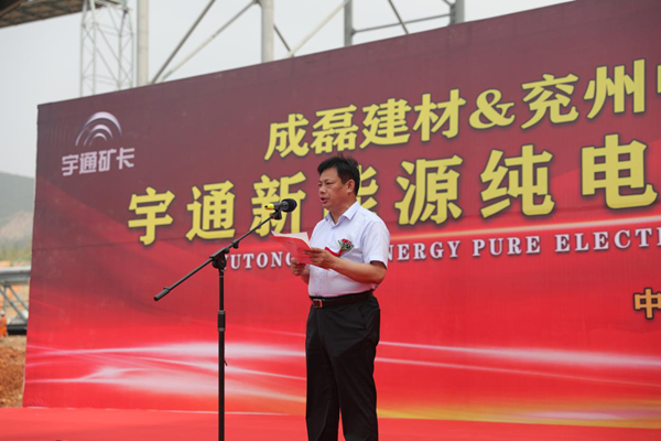 儀式現(xiàn)場(chǎng)彩旗飄飄,人聲鼎沸,場(chǎng)面氣氛熱烈而隆重。首先,宇通礦用裝備銷售公司總經(jīng)理馬勇先生致詞,馬總介紹了宇通客車響應(yīng)國(guó)家政策在新能源礦車領(lǐng)域擁有的先進(jìn)技術(shù)和取得的市場(chǎng)成就,以及對(duì)兗州中材建設(shè)有限公司、禹州市成磊建材有限公司美好明天的祝福。隨后,兗州中材建設(shè)有限公司副總經(jīng)理顏景祥先生上臺(tái)致詞,顏總強(qiáng)調(diào),兗州中材建設(shè)有限公司作為中央企業(yè)是更具有社會(huì)責(zé)任感的企業(yè),兗州中材在謀求發(fā)展的同時(shí)積極貫徹國(guó)家政策,在礦山施工中率先使用新能源設(shè)備,為構(gòu)建“資源節(jié)約型、環(huán)境友好型”社會(huì)做出應(yīng)有的貢獻(xiàn),承擔(dān)央企責(zé)任,擔(dān)負(fù)央企職責(zé)。最后,禹州市成磊建材有限公司總經(jīng)理張景奇先生致詞,張總肯定了兗州中材建設(shè)有限公司在礦山施工中采用更加安全環(huán)保新型設(shè)備的工作,期望兗州中材建設(shè)有限公司依靠過(guò)硬的施工技藝、新型的生產(chǎn)設(shè)備、高效的管理模式將禹州市成磊建材有限公司礦山在全省乃至全國(guó)范圍內(nèi)樹(shù)立標(biāo)桿,打造成示范性礦山。