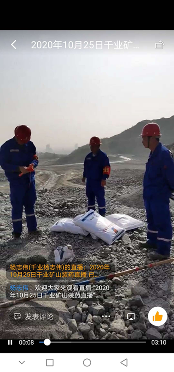 近日,焦作市公安局支隊(duì)領(lǐng)導(dǎo)按照河南省廳民爆未端管控全視頻要求,建立了覆蓋全市可視頻的釘釘群,組織了焦作市轄區(qū)爆破作業(yè)人員本群,對(duì)爆破作業(yè)進(jìn)行全程跟蹤管理。馬村分公司積極響應(yīng)南省民爆末端管控全視頻要求,組織爆破作業(yè)相關(guān)人員進(jìn)入“焦作市爆破作業(yè)管控群”,利用將爆破現(xiàn)場(chǎng)進(jìn)行直播,主要直播人員到位情況(三大員及工程技術(shù)人員是否到位)、卸車(chē)、電子雷管入庫(kù)、裝填、起爆等視頻。 在爆破作業(yè)中,首先,現(xiàn)場(chǎng)人員全部到位,包括爆破工程技術(shù)人員1名,爆破員2名,安全員1名,保管員2名,持各自人員名片進(jìn)行報(bào)到。  當(dāng)運(yùn)輸巖石粉狀大包和電子雷管的車(chē)到達(dá)作業(yè)地點(diǎn)后,對(duì)數(shù)量進(jìn)行清點(diǎn),卸車(chē)。直播開(kāi)始。  下圖為將電子雷管進(jìn)行入庫(kù)。  下圖為爆破員進(jìn)行裝填直播。 最后,起爆直播。 馬村分公司經(jīng)過(guò)三天釘釘視頻直播的摸索與實(shí)踐,逐步建立起完整可行的直播過(guò)程,且受到市局相關(guān)領(lǐng)導(dǎo)的口頭表?yè)P(yáng)。馬村分公司將會(huì)一直嚴(yán)格按照焦作市局要求,利用釘釘直播,實(shí)現(xiàn)民爆末端管控全視頻要求。 |