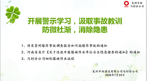 馬村分公司于7月23日下午在會(huì)議室舉行了“開展警示學(xué)習(xí),汲取事故教訓(xùn),牢筑安全防線”的會(huì)議,會(huì)議為大家轉(zhuǎn)發(fā)了《貴州凱里市舟溪鎮(zhèn)“3.19”較大爆炸事故調(diào)查報(bào)告》及河南欒川縣爆炸事故有關(guān)情況、河南省省廳《關(guān)于迅速開展爆破作業(yè)單位安全隱患排查的通知》。同時(shí)為了認(rèn)真貫徹“安全第一、預(yù)防為主”的方針,切實(shí)做好現(xiàn)場安全爆破作業(yè),并規(guī)范管理使用民用爆炸物品的工作,從根本上消除爆破安全隱患,杜絕爆破事故的發(fā)生,實(shí)現(xiàn)安全生產(chǎn),馬村分公司參會(huì)人員學(xué)習(xí)爆破作業(yè)安全規(guī)程的相關(guān)知識(shí)。 學(xué)習(xí)完調(diào)查事故報(bào)告及相關(guān)通知后,分公司涉爆人員紛紛根據(jù)自身工作情況結(jié)合學(xué)習(xí)內(nèi)容積極展開自查自糾活動(dòng),其中結(jié)合分公司公司實(shí)際,管理人員提出以下問題: 分公司執(zhí)行經(jīng)理劉黨提出:一是現(xiàn)場涉爆人員在卸載炸藥時(shí),要輕拿輕放,避免炸藥和地面石塊等發(fā)生碰撞,產(chǎn)生火花發(fā)生殉爆;二是在制作起爆器材時(shí),用木棍先在乳化炸藥包裝上扎眼,再插入電子雷管,禁止用金屬物件,以免發(fā)生安全隱患。 經(jīng)理助理曲光澤提出:一是在民爆物品審批時(shí),一定要按照打孔孔數(shù)申報(bào),提前規(guī)劃、計(jì)算好需要的數(shù)量,防止數(shù)量過多,以免后續(xù)存在安全隱患;二是有爆破作業(yè)時(shí),一定按照河南省公安下發(fā)的通知,爆破工程技術(shù)人員、爆破員(2人)、安全員及保管員(2人)及時(shí)到位,履行各自的職責(zé),并及時(shí)拍照上傳給公安機(jī)關(guān)。 安全員王建平提出:爆破現(xiàn)場要及時(shí)做好安全警戒,用警戒繩劃出爆破范圍;并且爆破作業(yè)區(qū)域內(nèi)禁止吸煙、攜帶打火機(jī),并要求現(xiàn)場人員相互監(jiān)督,及時(shí)制止不安全行為,消除一切安全隱患。 最后由項(xiàng)目經(jīng)理李文軍做最后總結(jié),先是通過對(duì)貴州凱里市舟溪鎮(zhèn)“3.19”較大爆炸事故調(diào)查報(bào)告的學(xué)習(xí),大家要學(xué)習(xí)“四不放過”原則,深刻汲取事故教訓(xùn),防微杜漸,消除隱患。并且著重強(qiáng)調(diào)安全無小事,尤其是涉及到爆破作業(yè),更要小心謹(jǐn)慎,時(shí)刻謹(jǐn)記“四不傷害”原則,保證自己的安全也要保證他人的安全。更要注意細(xì)節(jié),從民爆物品的審批開始,必須有申請單,根據(jù)炮孔總米數(shù)計(jì)算藥量,爆破工程技術(shù)人員審批后,才可以進(jìn)行民爆信息平臺(tái)的申請,后續(xù)的領(lǐng)用、發(fā)放,裝卸,裝藥、填塞,警戒,起爆,爆后檢查等一系列流程,都要保持著細(xì)心、小心、耐心的態(tài)度進(jìn)行各自的工作。同時(shí)要求分公司涉爆人員根據(jù)自己的崗位,細(xì)化流程,盡早擬定一份爆破作業(yè)流程,供分公司人員學(xué)習(xí)。