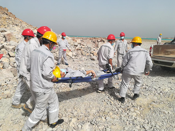 此次演練模擬場景為一名員工從邊坡墜落受傷后的緊急處理過程。接到現(xiàn)場巡視人員報告后,項目部立即啟動應(yīng)急響應(yīng),隨即通知應(yīng)急救援小組火速趕往事故現(xiàn)場進行救援。警戒疏散組拉起了安全警戒線,封鎖事故現(xiàn)場,維持現(xiàn)場秩序;醫(yī)療救護組檢查傷者情況后,對傷員進行了簡單的救治和護理;技術(shù)處置組進入高處墜落現(xiàn)場,進行了高處墜落后的安全檢查,預(yù)防次生事故;物資保障組馬上聯(lián)系了醫(yī)院,做好了傷員接收的準備。各小組各司其職,演練現(xiàn)場井然有序,最后救護車輛趕到現(xiàn)場,將傷員送往醫(yī)院,演練活動結(jié)束。
