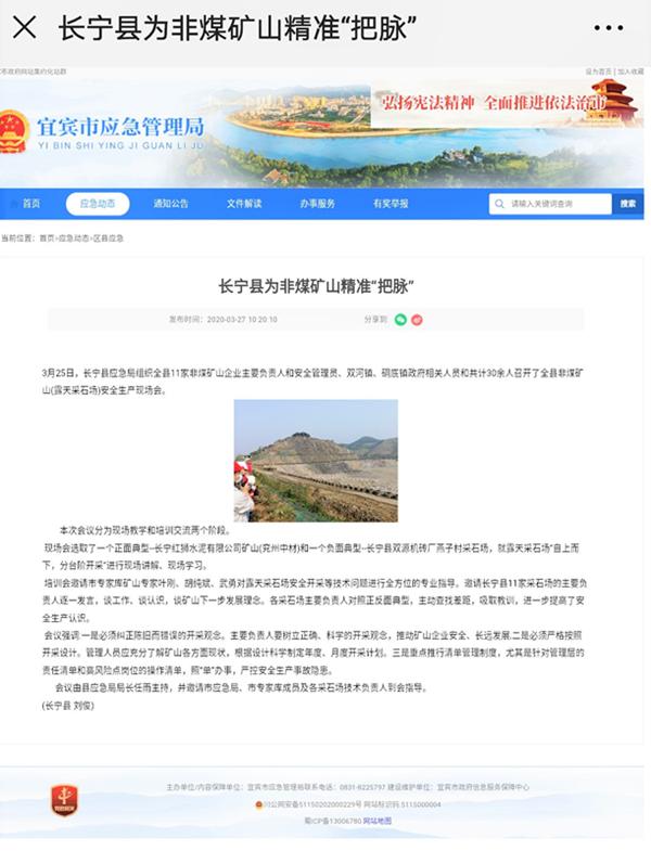 3月25日,宜賓市長寧縣應(yīng)急局組織全縣11家非煤礦山企業(yè)負(fù)責(zé)人和安全管理員、雙河鎮(zhèn)以及硐底鎮(zhèn)政府相關(guān)人員共計(jì)30余人召開了全縣非煤礦山(露天采石場)安全生產(chǎn)現(xiàn)場會。 長寧縣應(yīng)急局邀請兗州中材長寧分公司作為全縣非煤礦山的正面典型為參會企業(yè)分享開采經(jīng)驗(yàn)。 上午9點(diǎn)參會人員到達(dá)長寧分公司―紅獅水泥礦山現(xiàn)場,分公司員工與業(yè)主接待了到場的市縣領(lǐng)導(dǎo)以及企業(yè)參會人員。同時(shí)嚴(yán)格按照防疫要求進(jìn)行體溫測量,人員信息登記入場。   9:30分全部人員到齊,由長寧分公司職工帶領(lǐng)大家參觀礦山現(xiàn)場,為參觀人員介紹礦山整體情況,相關(guān)開采技術(shù),并解答參觀人員提出的問題。    10:30參觀結(jié)束,參觀人員對于此行都感到滿意,我們的礦山工作也得到了大家的認(rèn)可,相關(guān)同仁們都紛紛表達(dá)此行收獲甚多。 現(xiàn)場參觀學(xué)習(xí)結(jié)束后,當(dāng)天下午召開了室內(nèi)培訓(xùn)會,培訓(xùn)會邀請了市專家?guī)鞂<?,同時(shí)長寧分公司職工葉剛同志很榮幸在受邀之列。 針對于非煤礦山安全開采等技術(shù)問題,兗州中材長寧分公司作為正面企業(yè)給參會企業(yè)分享了好的經(jīng)驗(yàn),同時(shí)也從會議中汲取了其他好的經(jīng)驗(yàn)方法。 3月27日,宜賓市應(yīng)急管理局報(bào)道了此次會議。此次會議中市縣領(lǐng)導(dǎo)高度評價(jià)了兗州中材長寧分公司的礦山開采工作,同時(shí)被市縣領(lǐng)導(dǎo)評為正面典型我司感到很榮幸。在此后的工作中我們要更努力,爭取更大的進(jìn)步,樹立好我們的企業(yè)形象。 |