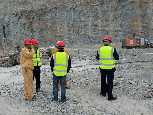 檢查團在項目部經(jīng)理康斌陪同下,對現(xiàn)場的生產(chǎn)和安全情況進行了視察。在視察中,領(lǐng)導們仔細查看了礦山生產(chǎn)的運輸、挖裝、鉆孔等設(shè)備的安全狀態(tài),以及運輸?shù)缆贰鯄?、平臺、邊坡防護等安全狀況,并向康經(jīng)理和安全員詳細詢問了施工中采取的各項安全措施和法規(guī)制度等的落實情況。現(xiàn)場視察完畢后,檢查團領(lǐng)導對我們的生產(chǎn)安全現(xiàn)狀進行了評價,高度肯定了我們的組織管理、安全措施和工程質(zhì)量等工作。同時也指出了現(xiàn)場的安全工作中的一些不足之處,要求我們要進一步加強鉆孔邊緣的安全防護,加強運輸車輛交通管理,加強爆破平臺平整度等的建設(shè)工作,希望項目部加快處理影響工程的各種不利因素,盡早攻克礦山開采過程中的難點,進一步和業(yè)主協(xié)商,積極主動并及時地解決在礦山開采過程中遇到的各種問題。