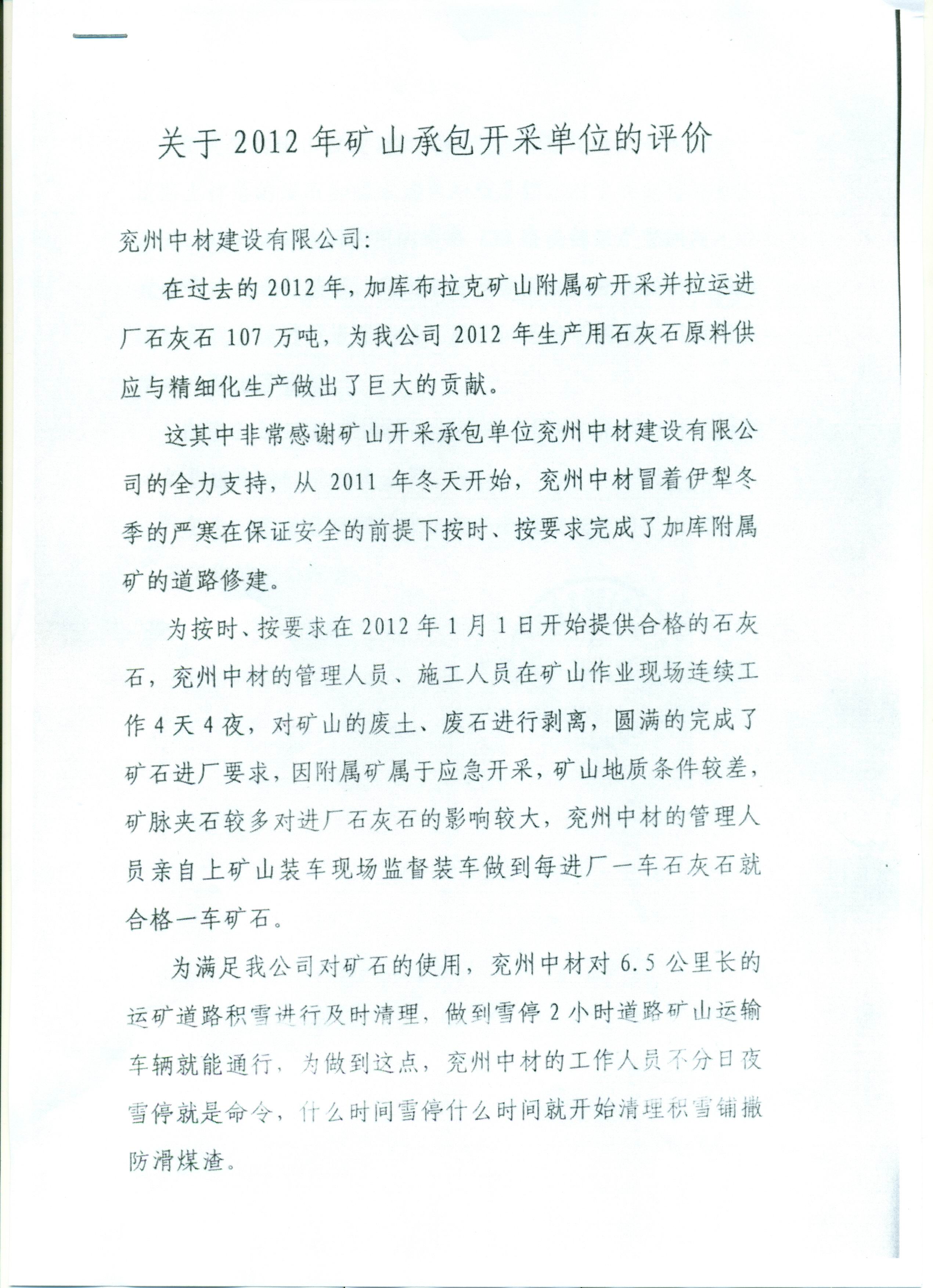 伊犁天山水泥有限責任公司對2012年礦山開采承包單位的評價