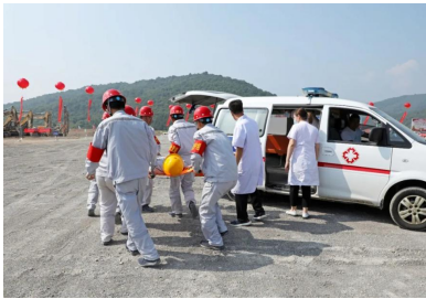 演練模擬在礦山現(xiàn)場1512平臺,由于雨后爆堆松軟,排險不及時,導(dǎo)致挖掘機(jī)進(jìn)行挖裝作業(yè)時發(fā)生坍塌事故,土石坍塌砸到駕駛室,車門無法正常開啟,駕駛員被困駕駛室并且傷情不明,現(xiàn)場管理人員向應(yīng)急指揮部報告后,立即啟動應(yīng)急預(yù)案,組織人員開展傷員救助。 演練開始前兗州中材呂梁分公司項目經(jīng)理王建立發(fā)表講話,并介紹了項目情況。王經(jīng)理表示,呂梁分公司成立十年來一直秉承一個央企的責(zé)任,履行企業(yè)的安全管理職責(zé),展現(xiàn)國有大型企業(yè)的擔(dān)當(dāng)。安全工作從嚴(yán)要求,做好企業(yè)安全形象。提升服務(wù)高度、精度和寬度,為礦山行業(yè)的健康發(fā)展貢獻(xiàn)力量。
