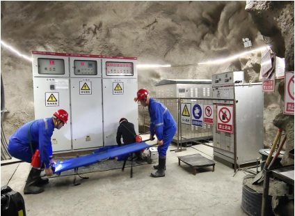 首先進行井下火災應急預案演練,此演練是模擬井下配電室起火,傷員在配電室中昏迷,需立即進行搶救工作。調(diào)度室接到報警后,立即通知受影響的其他作業(yè)人員撤離,并按照匯報程序及時通知帶班礦領(lǐng)導、礦長、相關(guān)科室及應急救援隊伍等人員。