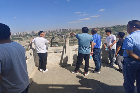 來到觀景臺邊,大家回望著來時的路,它就在腳下,不由得心懷感激,內心充滿著自豪感。向遠處眺望,奔騰的黃河在拐過大“幾”字彎沖出晉陜蒙峽谷后,進入晉陜兩省交界處變得特別溫順,母親河的水也變得特別清澈,該段也是黃河唯一一段自東向西的流向,看著奔流不息的黃河水,寓意著中華文明源遠流長,偉大的中國共產(chǎn)黨生生不息!