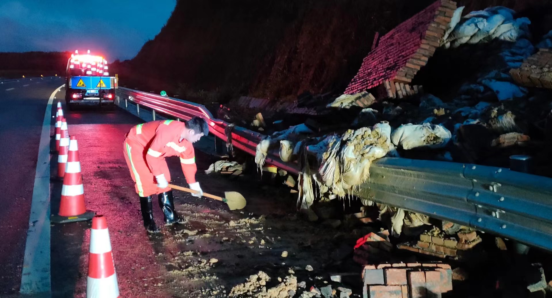 二、面對(duì)險(xiǎn)情,應(yīng)對(duì)處置。6月12日,莆炎高速B道294+100處邊坡溜方致使道路應(yīng)急車(chē)道及主車(chē)道受阻,明溪養(yǎng)護(hù)站立即啟動(dòng)防汛搶險(xiǎn)Ⅳ級(jí)響應(yīng),調(diào)動(dòng)應(yīng)急搶險(xiǎn)人員趕赴現(xiàn)場(chǎng)處置,經(jīng)過(guò)3個(gè)小時(shí)的奮戰(zhàn)把路面的泥土清理干凈。6月14日,蓬巖一號(hào)隧道出口出現(xiàn)溜方造成應(yīng)急車(chē)道及主車(chē)道受阻,新陽(yáng)養(yǎng)護(hù)站第一時(shí)間擺放安全設(shè)施,對(duì)溜方路段及時(shí)進(jìn)行處置,提示過(guò)往車(chē)輛減速慢行,經(jīng)過(guò)連續(xù)5個(gè)小時(shí)的搶險(xiǎn)工作才正式完成。