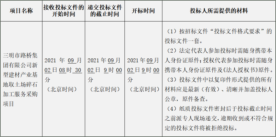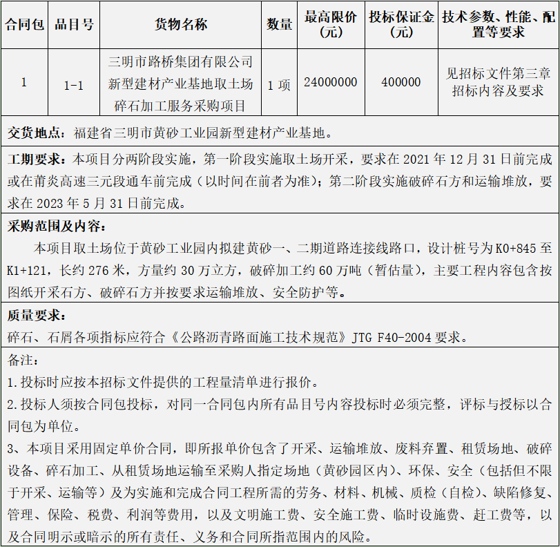 本公司受三明市路橋集團(tuán)有限公司的委托,就其所需的三明市路橋集團(tuán)有限公司新型建材產(chǎn)業(yè)基地取土場碎石加工服務(wù)采購項目進(jìn)行公開招標(biāo),歡迎符合條件的供應(yīng)商參加投標(biāo)。