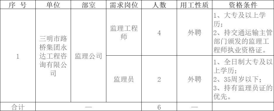 (一)公告。招聘崗位、人數(shù)、任職資格等信息在 “三明市路橋集團(tuán)”官網(wǎng)(m.023724.com)及“一覽監(jiān)理英才網(wǎng)”官網(wǎng)(http://www.jljob88.com)向社會(huì)統(tǒng)一公告。