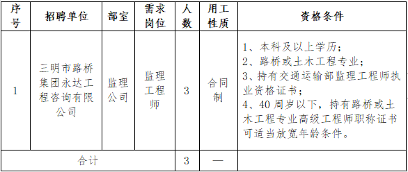 (一)公告。招聘崗位、人數(shù)、任職資格等信息在“三明市路橋集團”官網(wǎng)(m.023724.com)、眾聯(lián)人才招聘網(wǎng)(www.zlrczp.com)及一覽監(jiān)理英才網(wǎng)(www.jljob88.com)向社會統(tǒng)一公告。