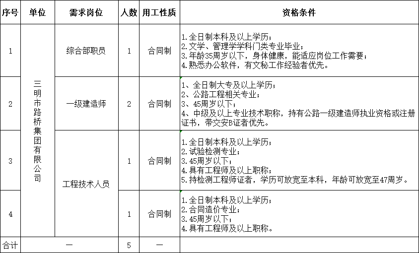 (二)報(bào)名。采取網(wǎng)絡(luò)報(bào)名方式,請應(yīng)聘者下載填寫《三明市路橋集團(tuán)有限公司公開招聘工作人員報(bào)名登記表》(附件),投遞至郵箱smslqjt@163.com(文件命名為“姓名+應(yīng)聘崗位”)。報(bào)名截止時(shí)間為2022年4月29日。