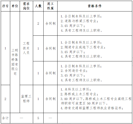 (二)報(bào)名。采取網(wǎng)絡(luò)報(bào)名方式,請(qǐng)應(yīng)聘者下載填寫(xiě)《三明市路橋集團(tuán)有限公司公開(kāi)招聘工作人員報(bào)名登記表》(附件),投遞至郵箱smslqjt@163.com(文件命名為“姓名+應(yīng)聘崗位”)。報(bào)名截止時(shí)間為2022年7月8日。
