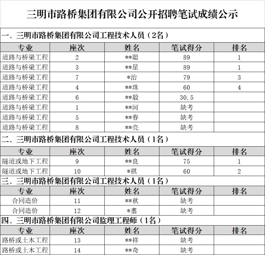 市路橋集團(tuán)公開招聘筆試環(huán)節(jié)已于2022年7月20日完成,現(xiàn)將筆試成績予以公示: