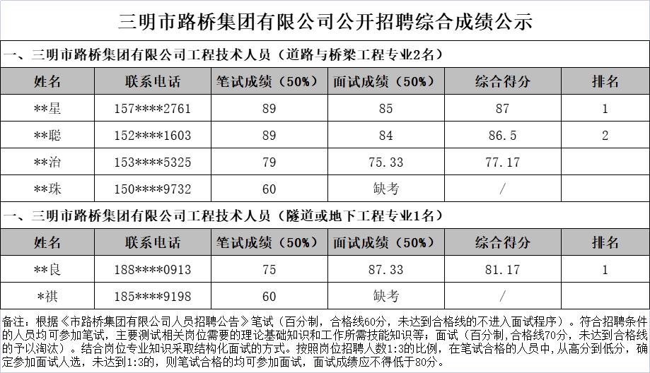根據(jù)《市路橋集團(tuán)有限公司人員招聘公告》,現(xiàn)將市路橋集團(tuán)有限公司公開招聘工作人員綜合成績及排名情況公示如下: