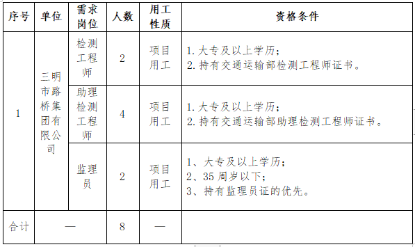 (一)公告。招聘崗位、人數(shù)、任職資格等信息在 “三明市路橋集團”官網(wǎng)(m.023724.com)“一覽英才網(wǎng)”官網(wǎng)向社會統(tǒng)一公告。