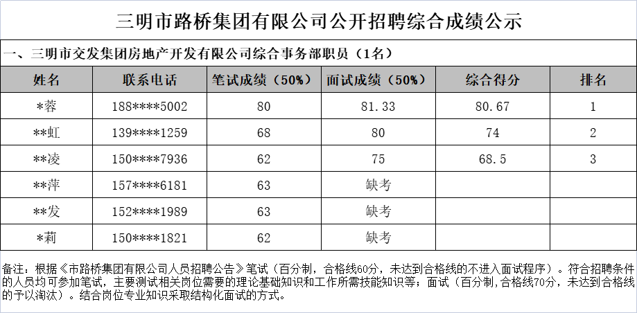 根據(jù)《市路橋集團(tuán)有限公司人員招聘公告》,現(xiàn)將市路橋集團(tuán)有限公司公開招聘工作人員綜合成績及排名情況公示如下: