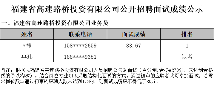 根據《省高速路橋投資有限公司人員招聘公告》,現將省高速路橋投資有限公司公開招聘工作人員面試成績及排名情況公示如下:
