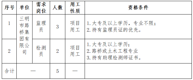 (一)公告。招聘崗位、人數(shù)、任職資格等信息在 “三明市路橋集團”官網(wǎng)(m.023724.com)向社會統(tǒng)一公告。