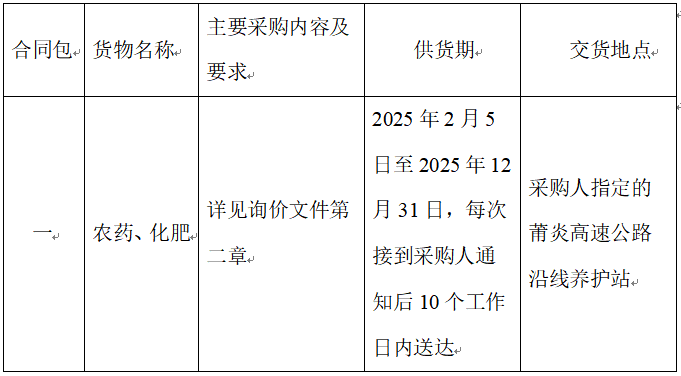 三明市路橋集團昌盛公路工程有限公司承接莆炎高速三明境日常養(yǎng)護工作,現(xiàn)需要采購一批農(nóng)藥、化肥,現(xiàn)對上述物資及服務(wù)進行詢價采購,歡迎合格報價人對該采購進行報價。